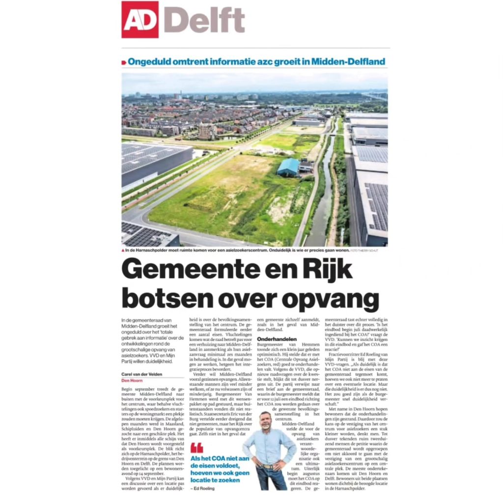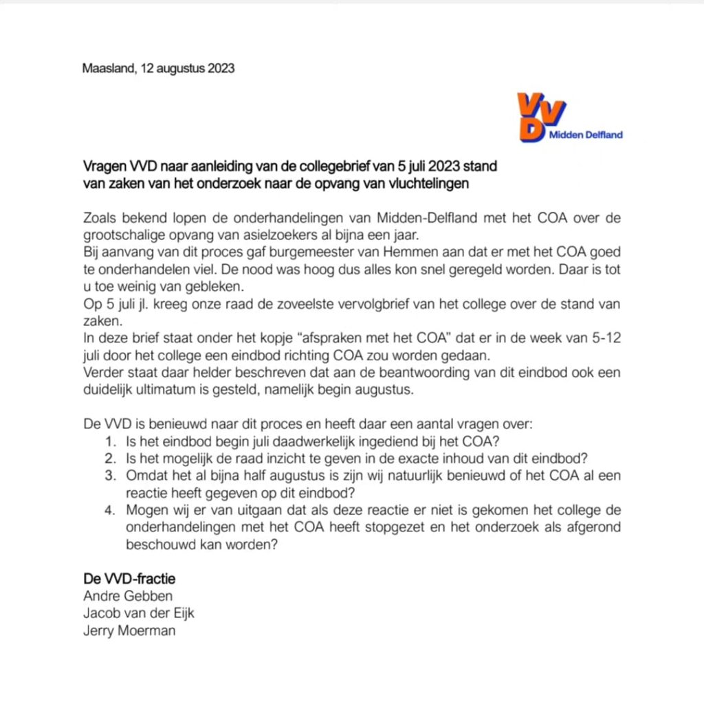 In het AD-artikel wordt verwezen naar vragen die de @vvd_middendelfland aan het college (de burgemeester + de 3 wethouders) heeft gesteld op 12 augustus. Deze vragen zijn op de tweede foto te vinden.